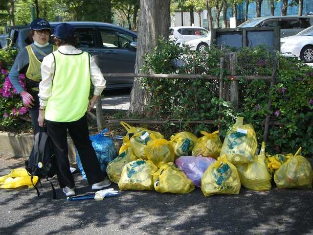![]() 大津ヶ丘交差点周辺から回収されたポイ捨てゴミを、缶類・ビン類・可燃など分別し、一まとめにする。 |