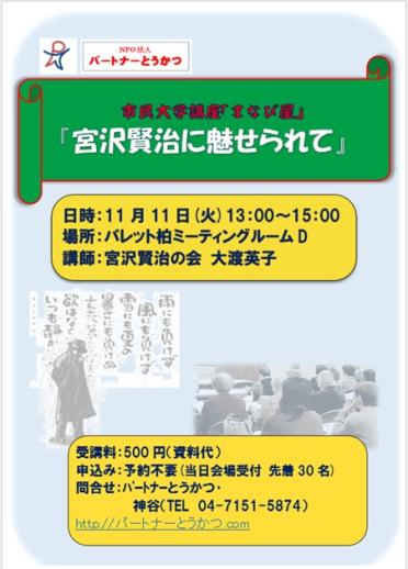 社会教育公開日:2025年11月13日11月度まなび屋講座「宮沢賢治に魅せられて」市民大学講座まなび屋 11月度
