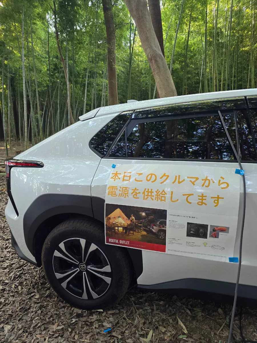 電源は千葉トヨタ自動車株式会社 我孫子店様のご協力により、電気自動車から給電。EVからの直接給電は、環境に優しい電力で、「森の中でeスポーツ」という新しい試みを実現させる為に安心して機器を稼働させる頼もしい手段となりました。